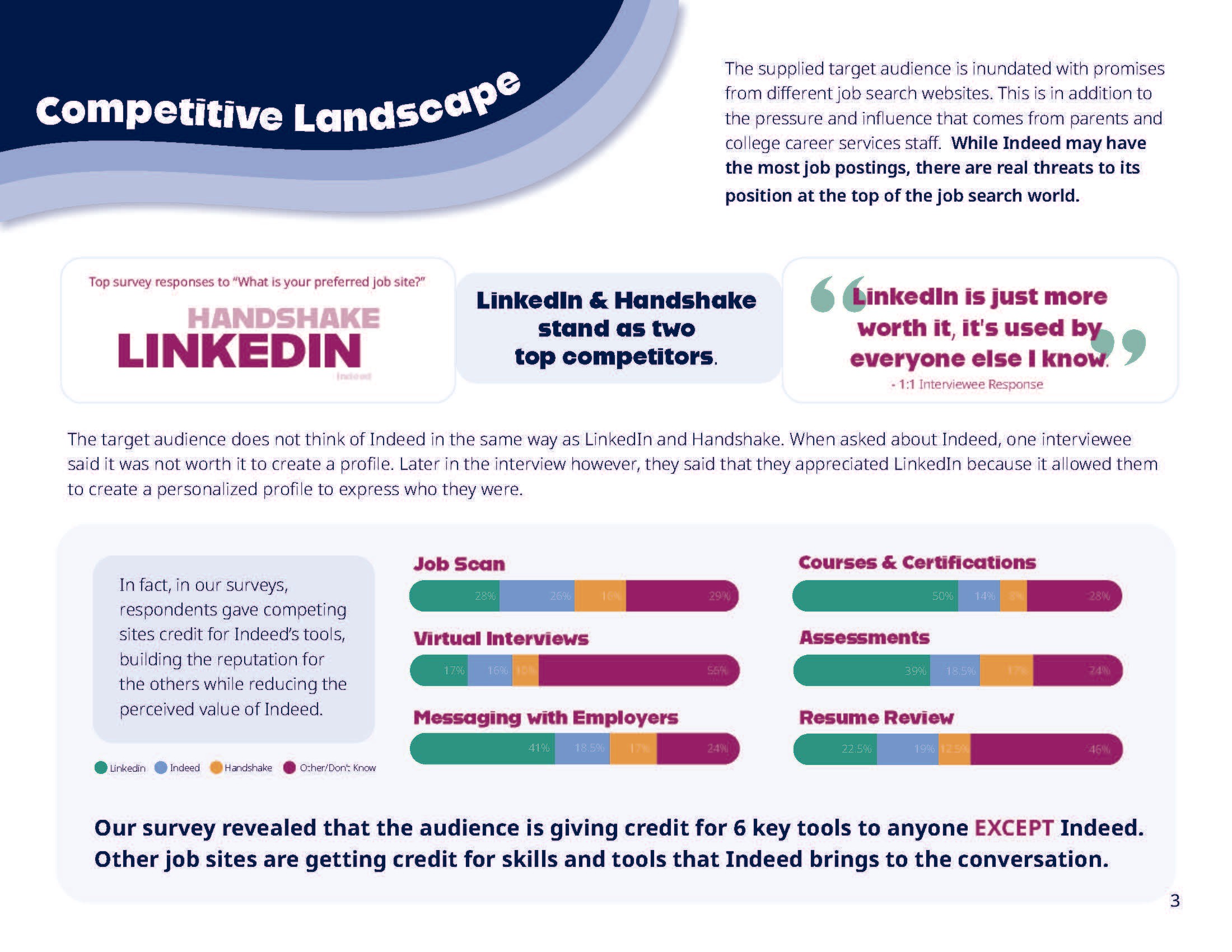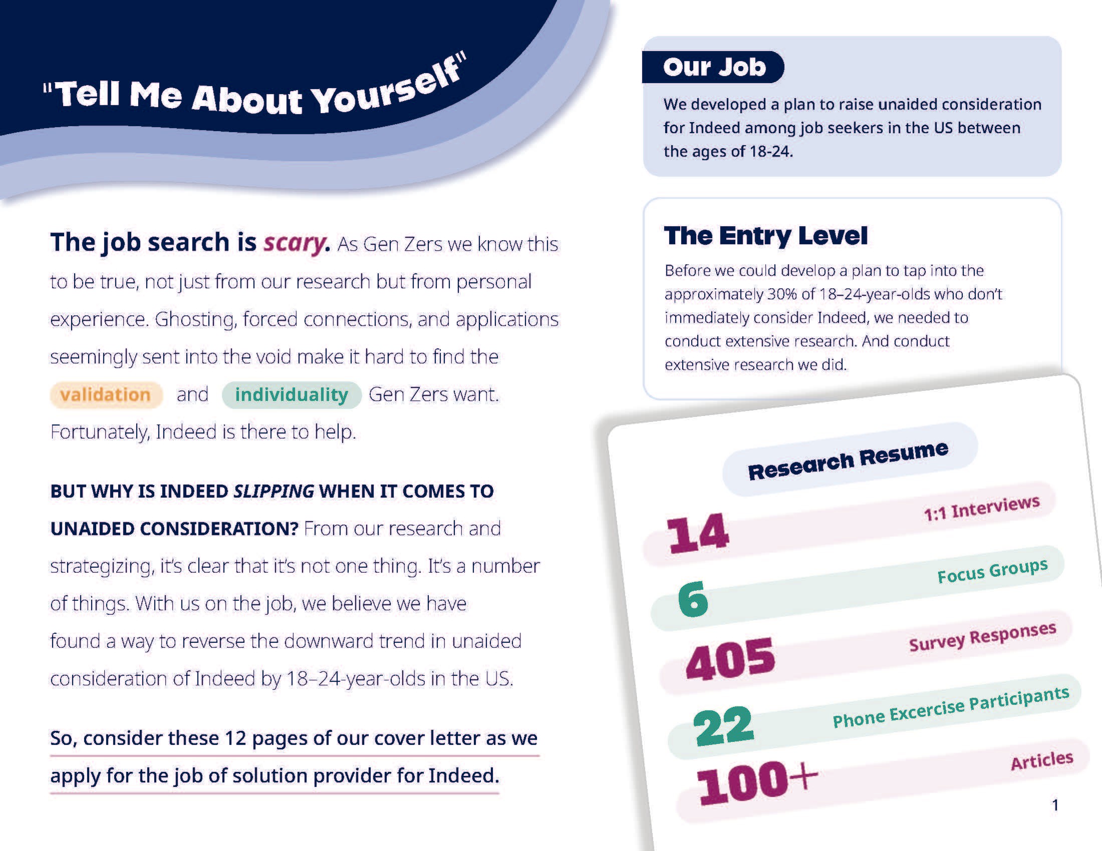 Teams were challenged with raising the unaided consideration and use of Indeed among Gen Z. With our research we decided to speak to the frustrated job seeker- college juniors, seniors, and recent graduates that were unemployed and tired of their job search. Our campaign followed central themes of empowerment, customization, and highlighting Indeed’s extensive toolbox.
