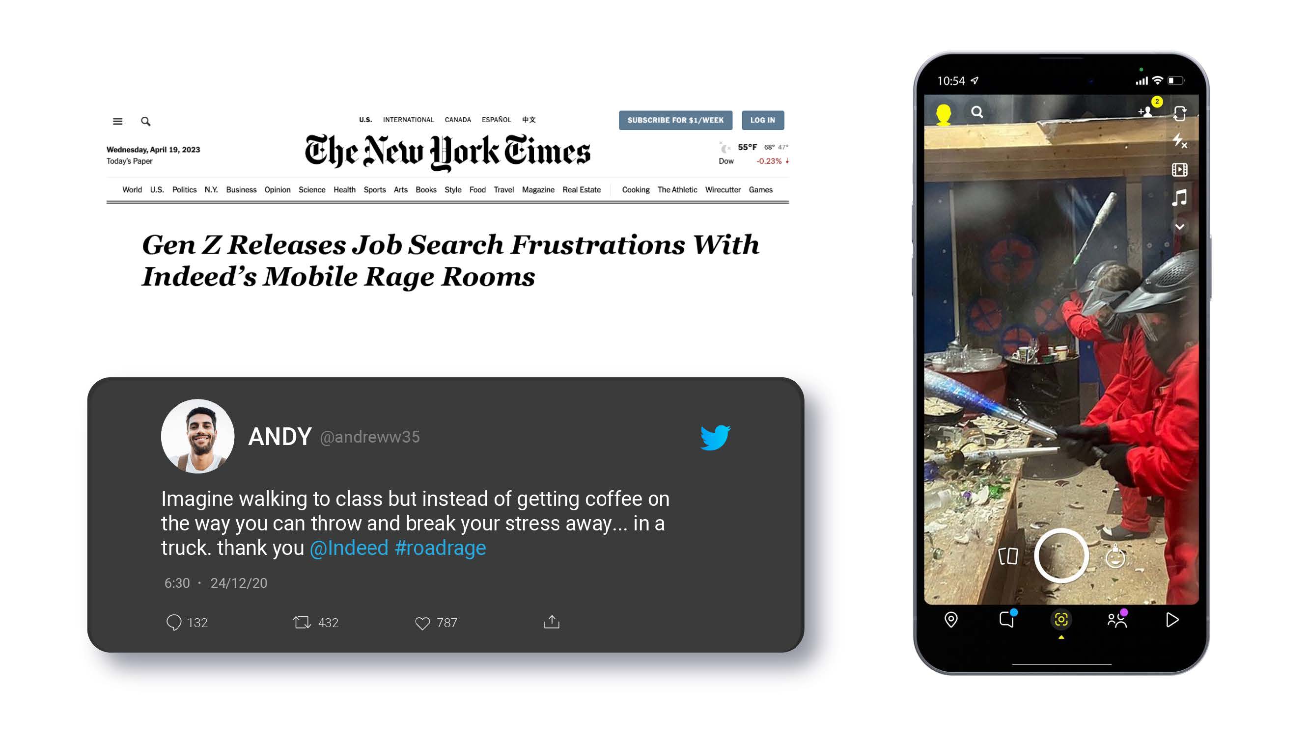 “Road Rage” was a hands-on interaction our audience could have with our otherwise digital client. This ‘mobile rage room’ would travel to different college campuses and serve as an outlet for our frustrated job seekers to have a little fun and let go of the very real stress that comes with graduating and job searching.