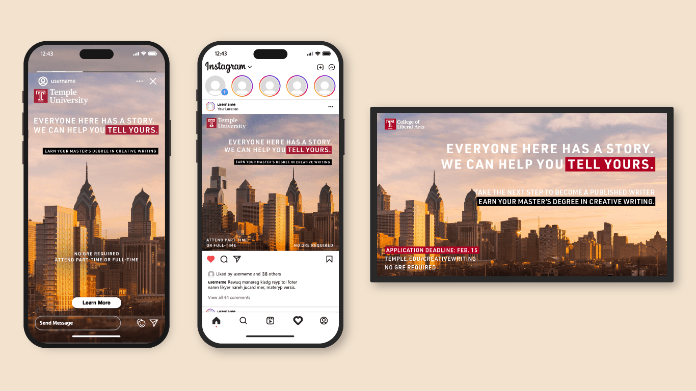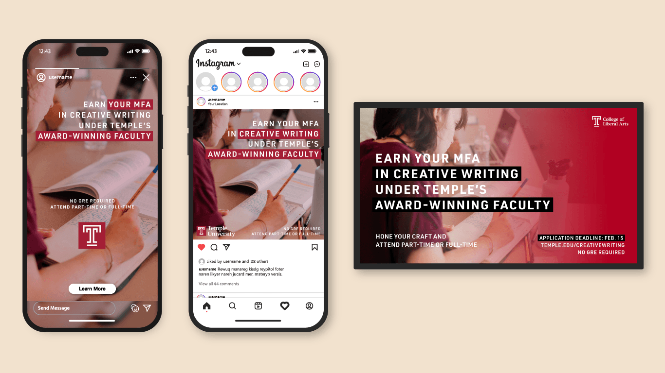 These designs ran as social ads on Instagram and Facebook, on Temple-owned screens throughout campus, and digital billboards on I-95 and I-76. The paid social campaign ran with great success, specifically high interaction rates from our Facebook ads.