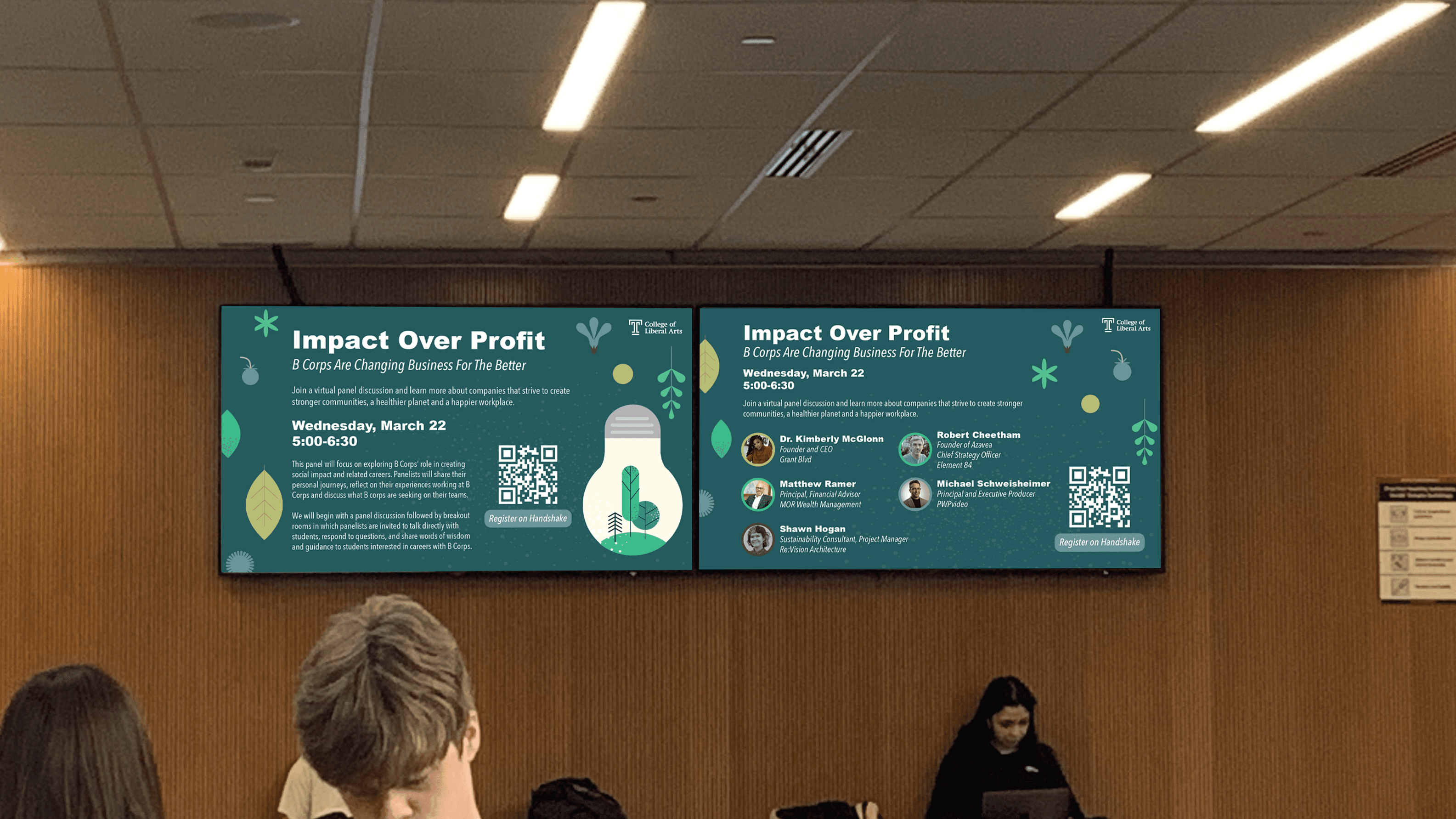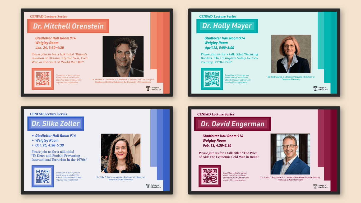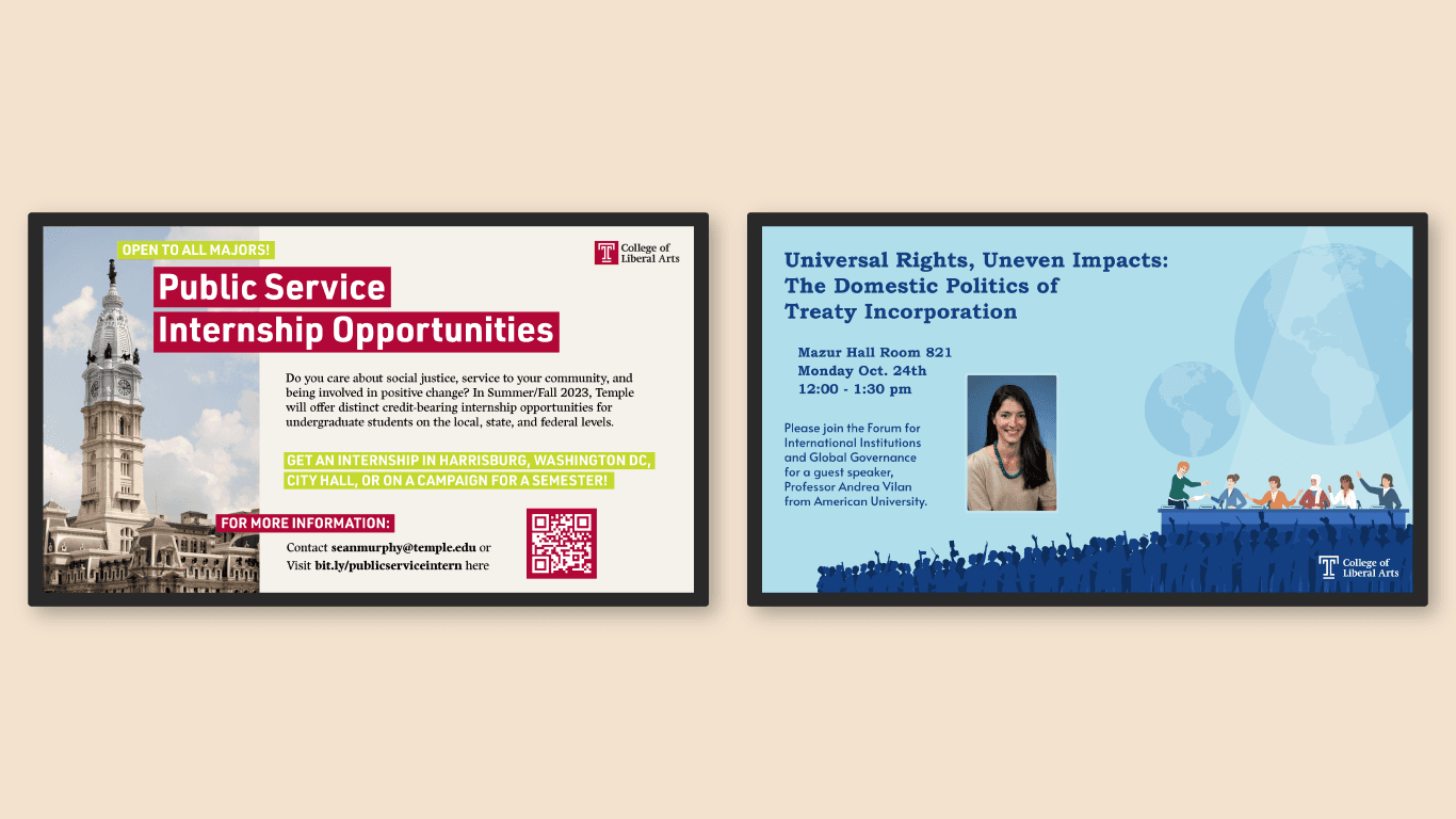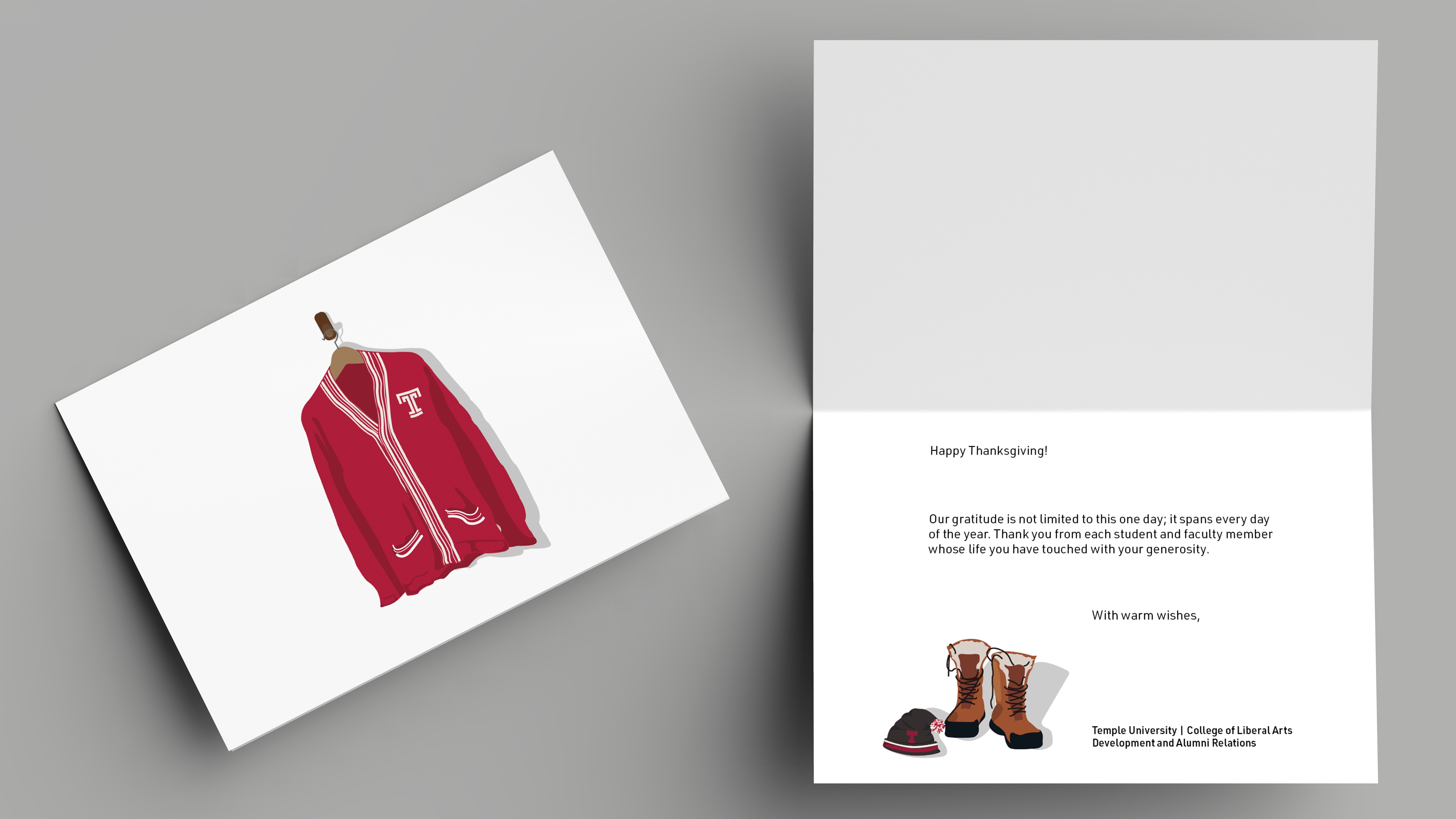 I was the graphic designer on the College of Liberal Arts Marketing and Communications team during my senior year at Temple. The majority of my work involved creating visual identities for the various speakers, clubs, and events that were going on within the college. I sourced a variety of assets and photos, in addition to creating my own illustrations and templates, to make sure unique events and related events appeared as such. I also designed a variety of outward communications such as flyers, emails, and holiday cards sent to CLA faculty, donors, and the community.