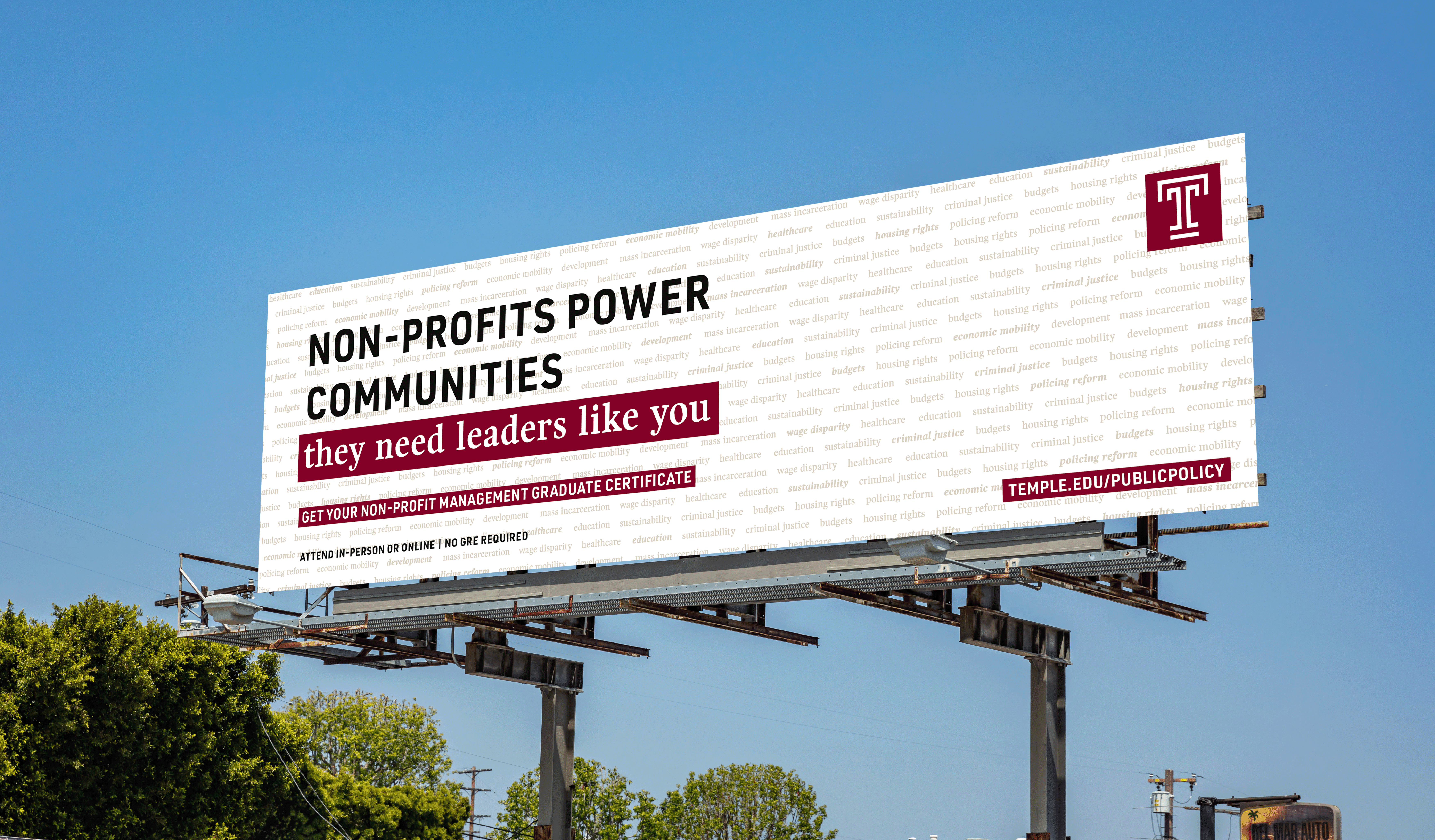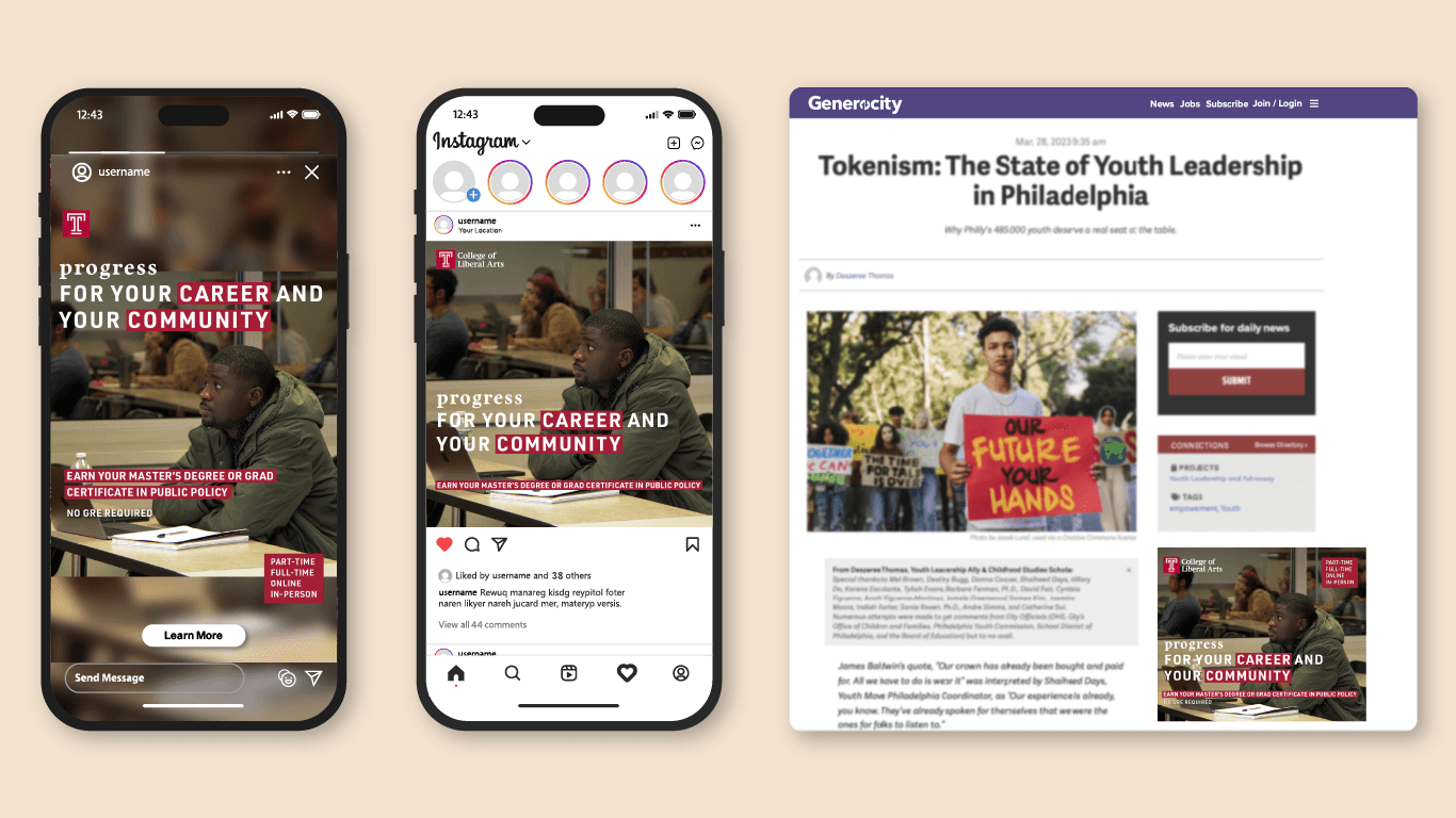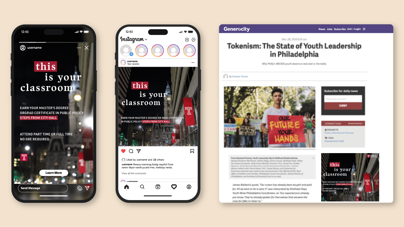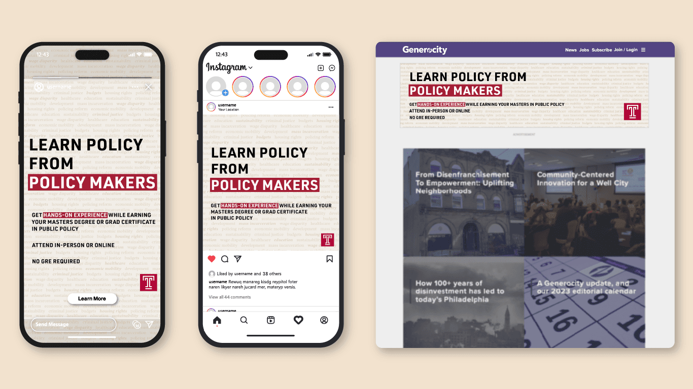 The three creative concepts ran as digital ads on Generocity and Billy Penn; as social media ads on Facebook and Instagram; on Temple-owned screens throughout campus; and on billboards that summer.